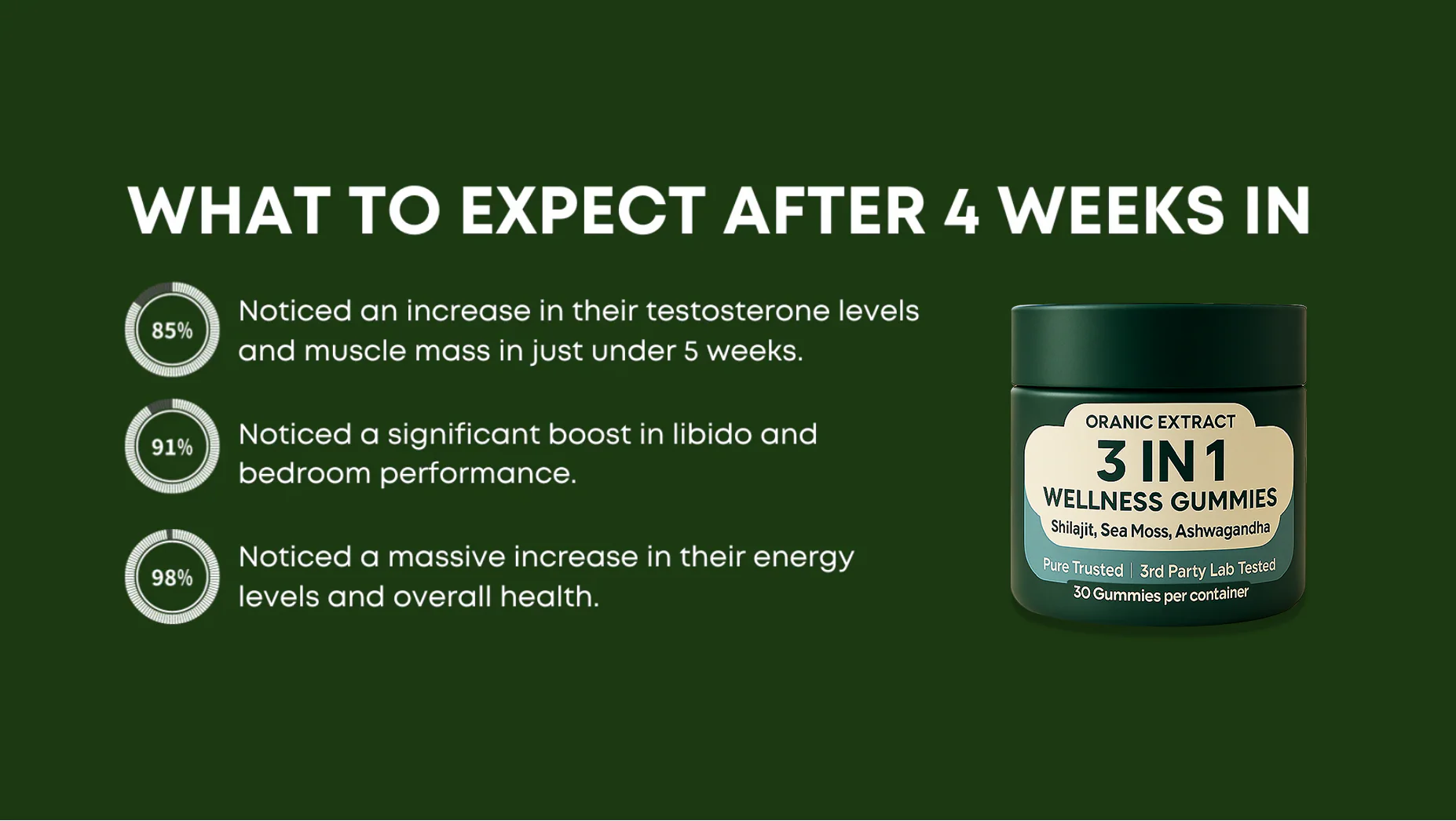 If you use ORGANIC EXTRACT® 3-in-1 Wellness Gummies for 30 days and don't experience an increase in your testosterone, sexual health, energy, and more, send an email to contact@organicextractstore.com we'll give you full refund.