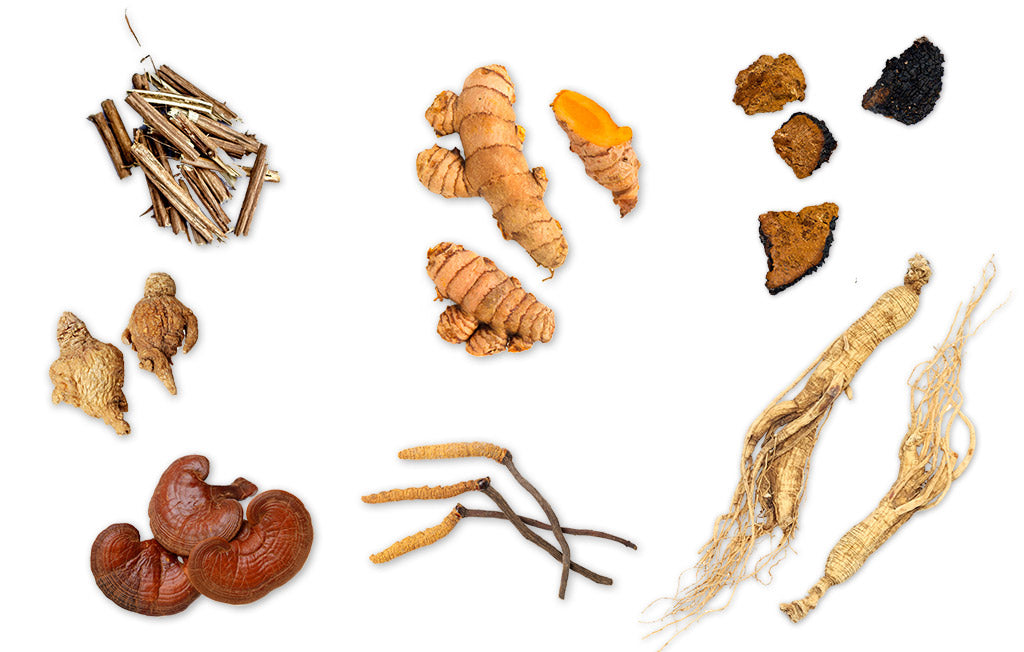 Maca Root, Ashwagandha Root, Reishi Mushroom, Turmeric Root, Cordyceps Mushroom, Chaga Mushroom, Ginseng Root.