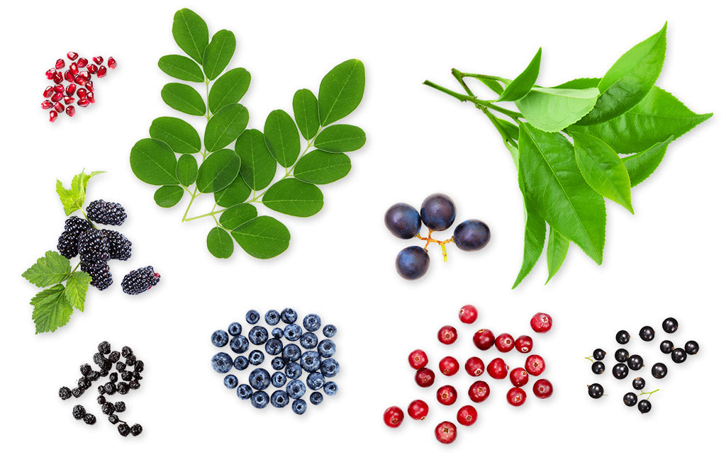 Moringa Leaf, Matcha Green Tea, Blackberry, Grape, Blueberry, Pomegranate, Cranberry, Maqui Berry, Black Currant.