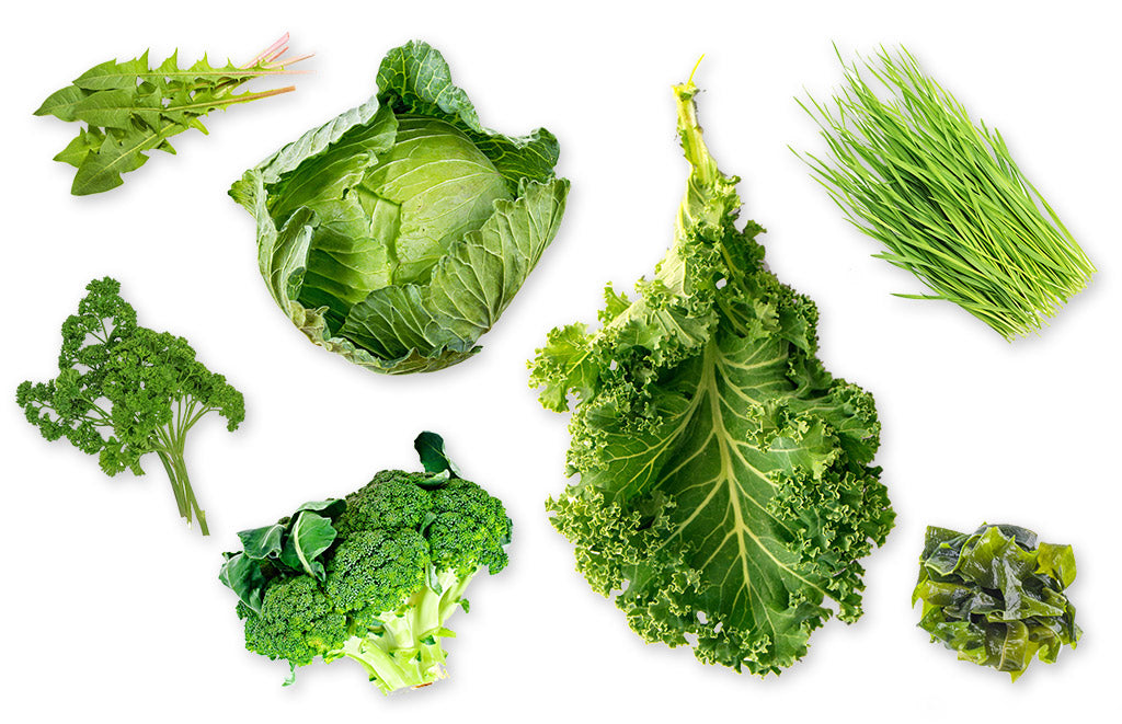 Alfalfa Leaf, Barley Grass, Oat Grass, Wheatgrass, Spirulina, Chlorella, Parsley, Broccoli, Kale, Dandelion, Sea Kelp, Dulse, Cabbage, Broccoli Sprout.